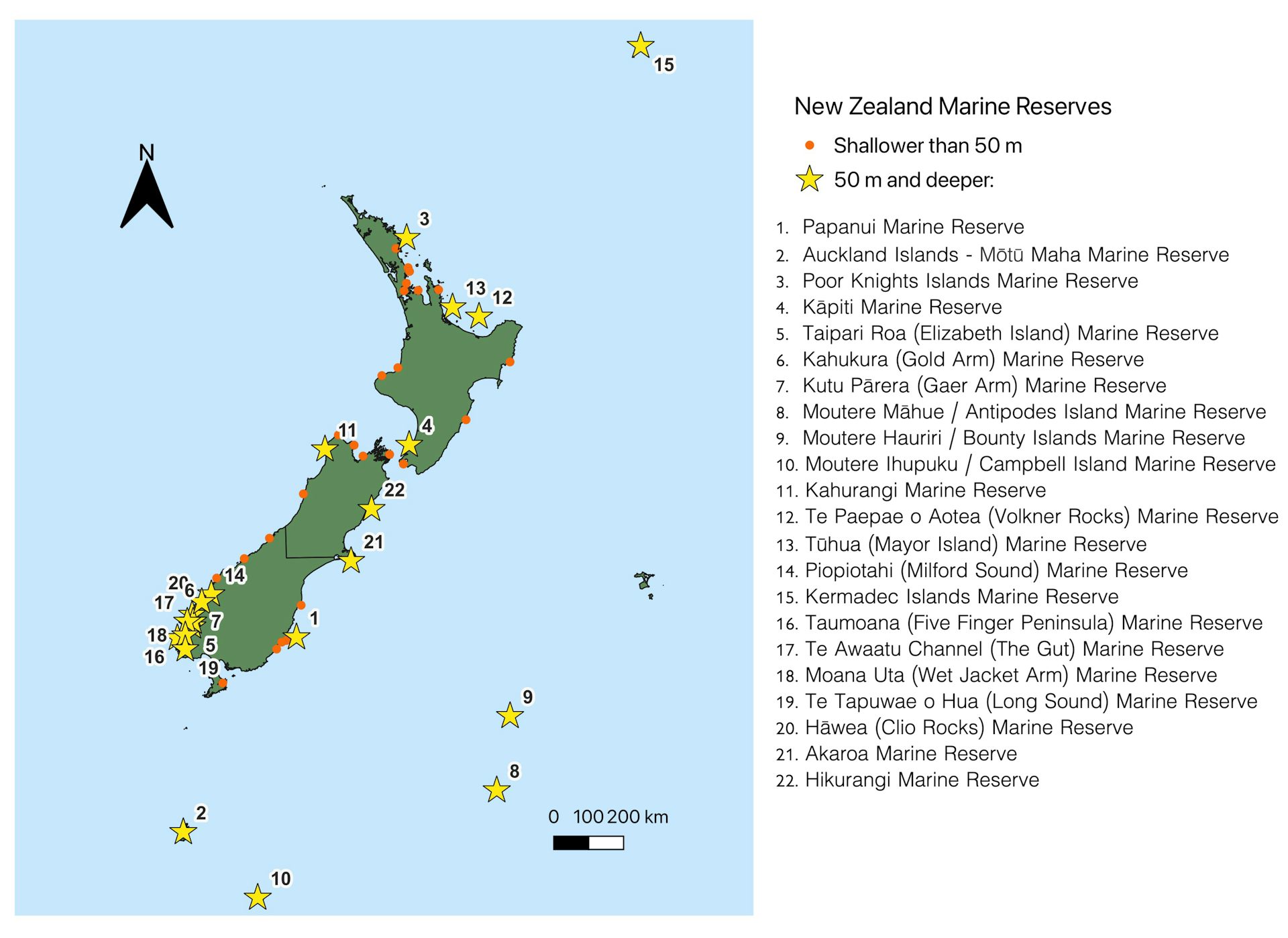 Our assessment of the current network of 44 marine reserves in New Zealand shows the majority contain areas of rocky reef, but only half have reefs below 50 metres.