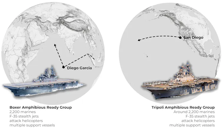 President Trump has ordered reinforcements from two naval groups into the Middle East, consisting of around 4,500 marines and dozens of aircraft. The Conversation, NYT, Al Jazeera, CC BY-SA