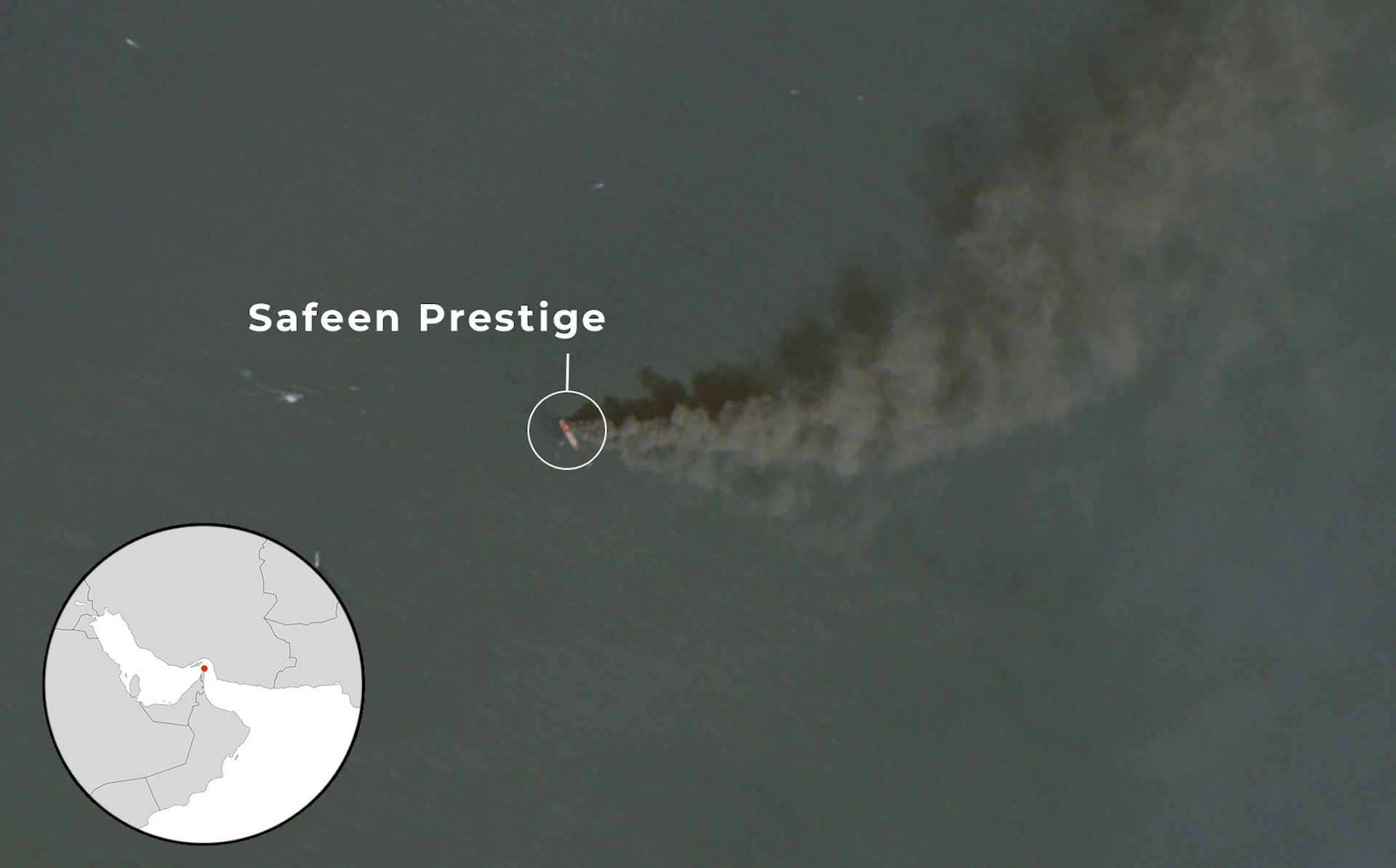 The Malta-flagged container vessel Safeen Prestige on fire in the Strait of Hormuz on March 18 after being hit by Iranian explosives. Copernicus Sentinel-2 satellite, CC BY-SA