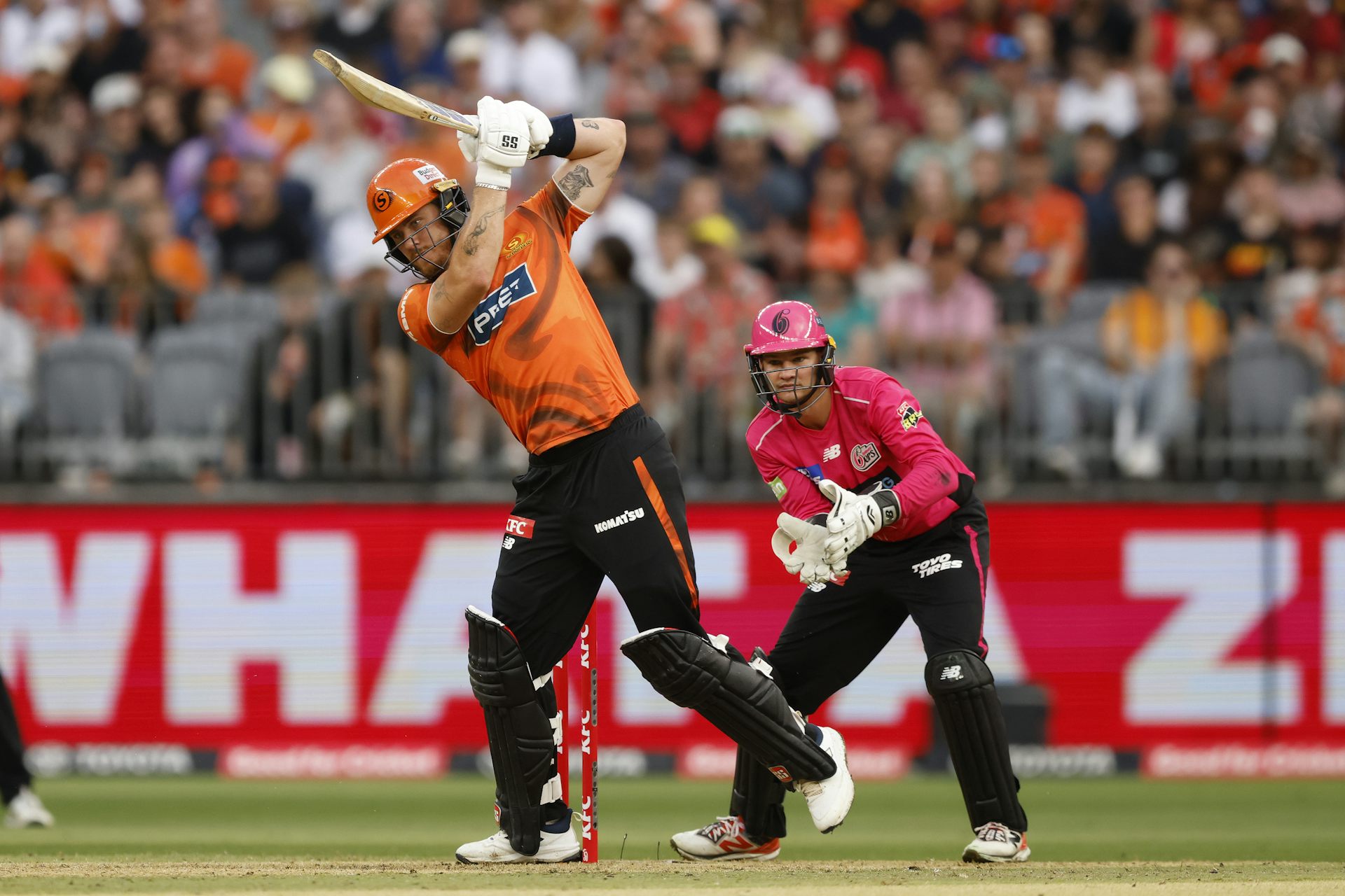 Finn Allen playing for the Perth Scorchers at the Big Bash League final with the Sydney Sixers, January 25. James Worsfold/Cricket Australia via Getty Images