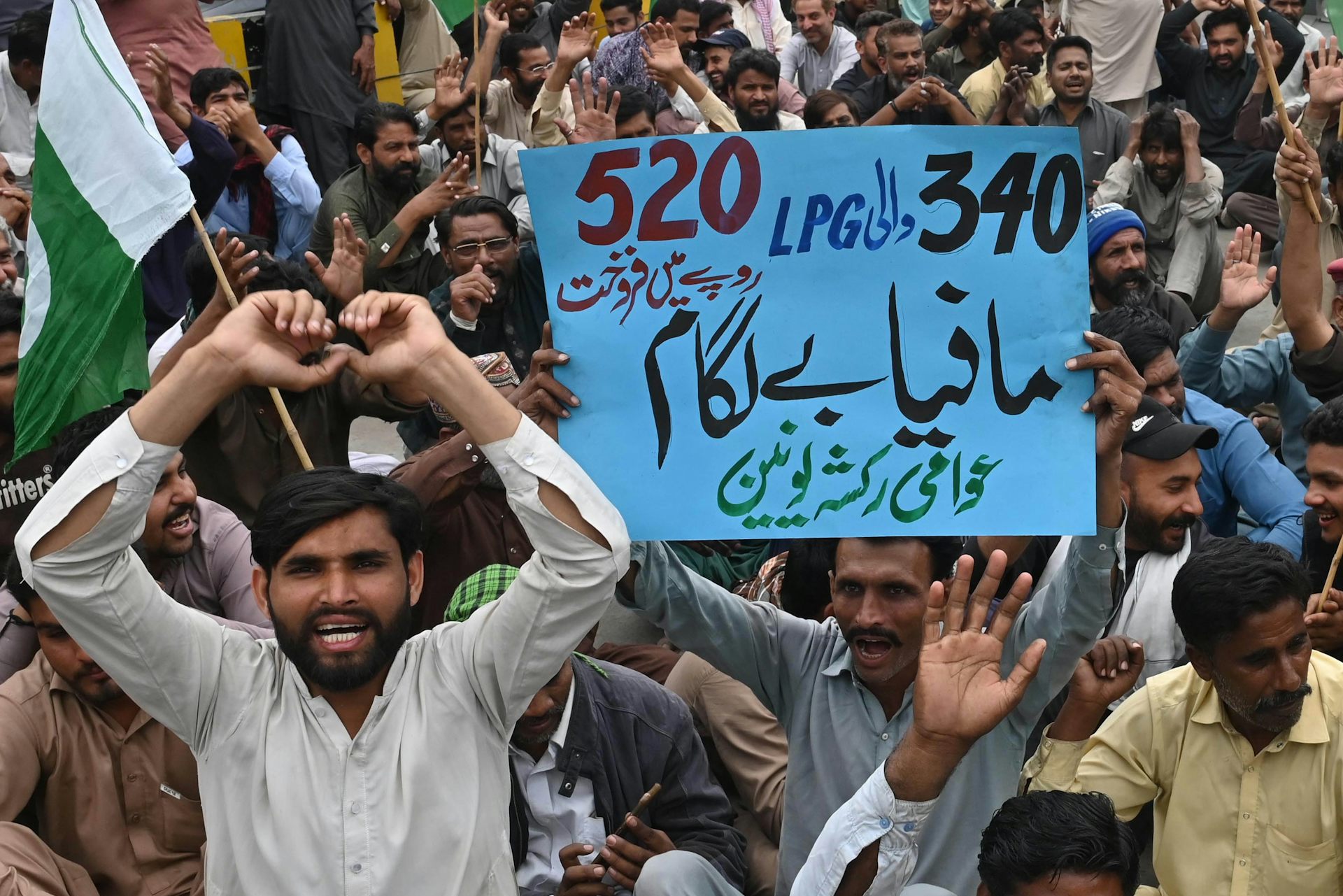 rickshaw driver holding sign protesting rising fuel prices in Pakistan