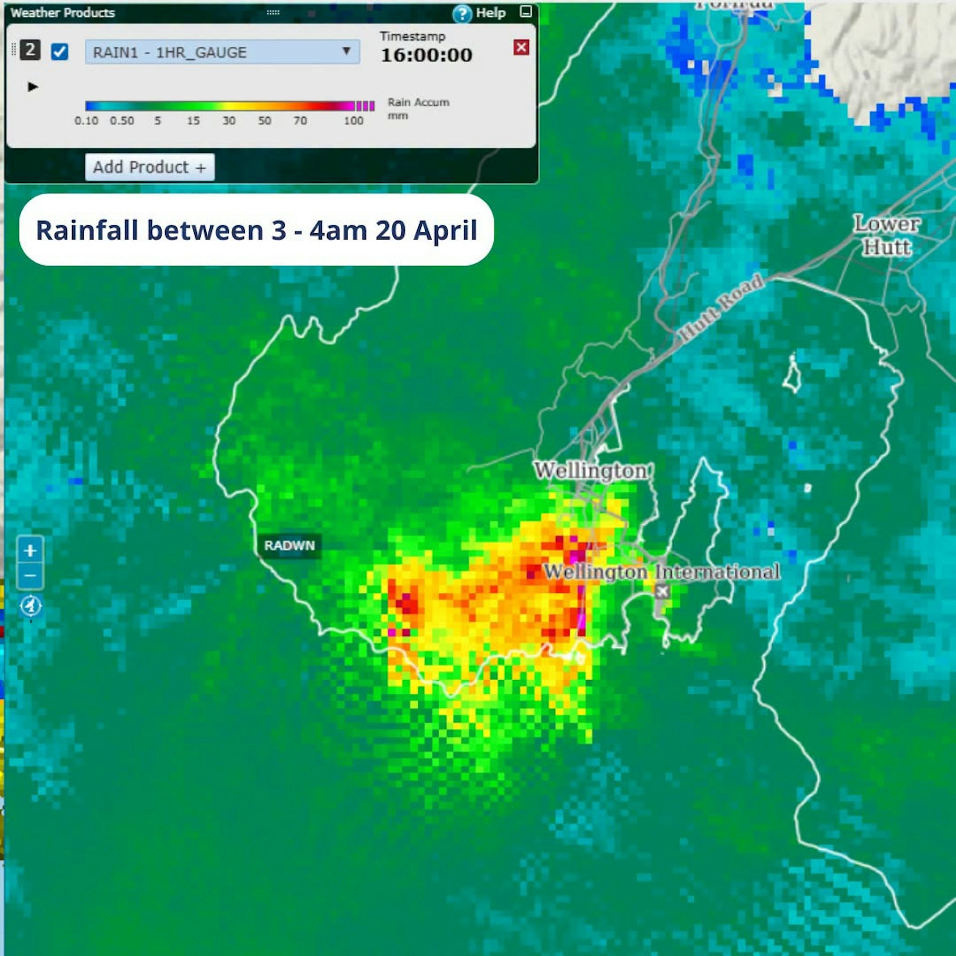 MetService reported that more than 70mm of rain fell in just one hour in parts of southern Wellington early on Monday morning. That is more than half the total rainfall typically recorded at the city’s Botanical Gardens over the whole of April.