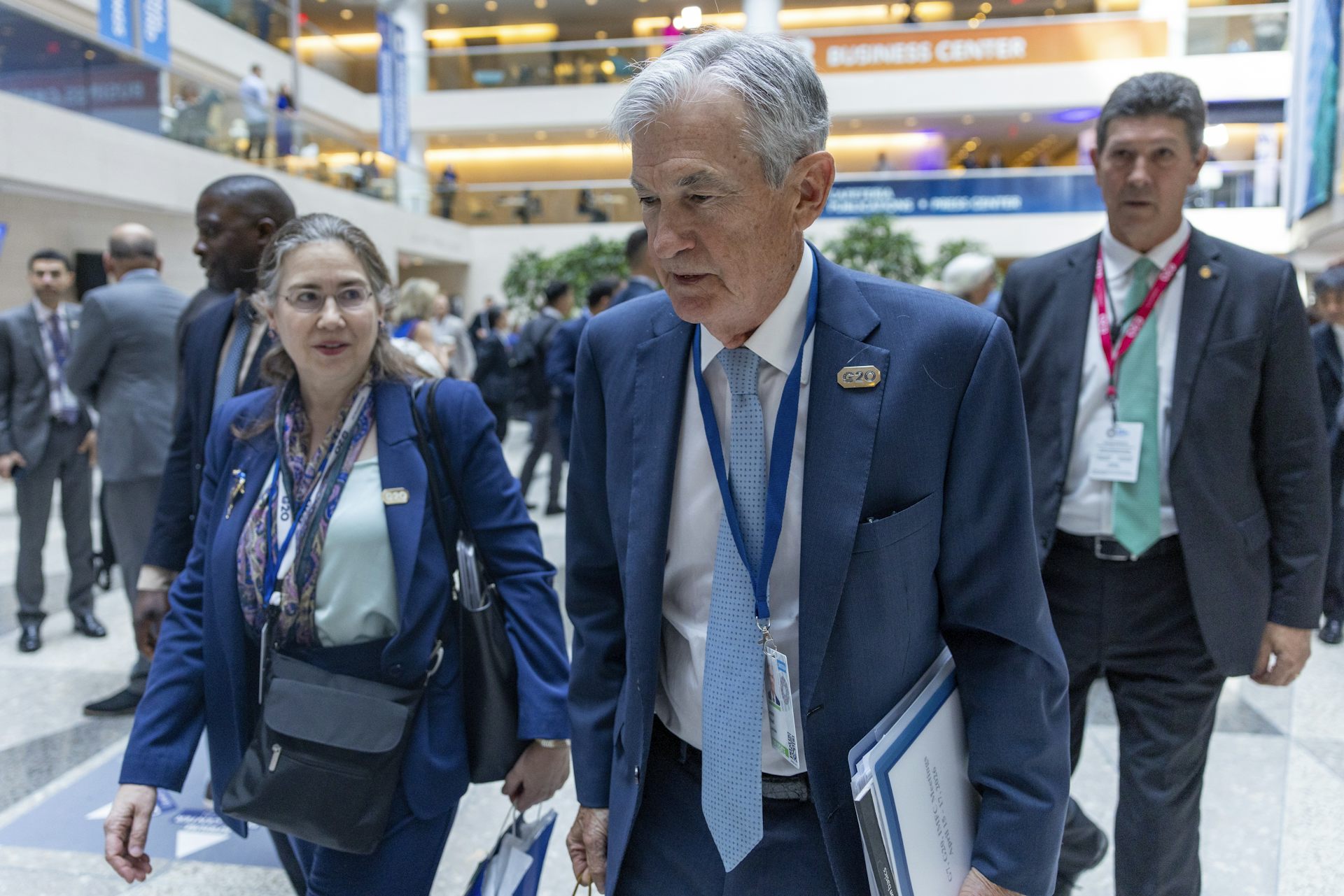 US Federal Reserve Chair Jerome Powell and others seen walking