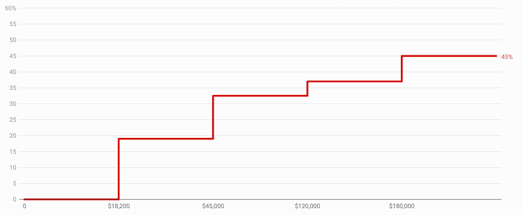 Here’s how it works. The first A$18,200 are tax-free, the rest up to $45,000 are taxed at 19 cents in the dollar, the rest up to $120,000 at 32.5 cents in the dollar, the rest up to $120,000 at 37 cents in the dollar, and anything in excess of $180,000 is taxed at 45 cents in the dollar.
