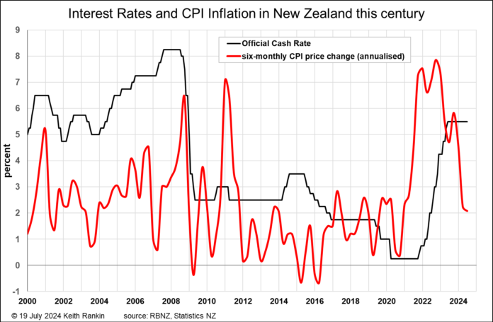Further, in the first three months of 2024 – as the first chart shows – the CPI inflation rate was 2.25%. This means that the Reserve Bank, focussing on CPI inflation, should have reduced the OCR in April. Yet it still has not done so, despite this month reviewing its interest rate.