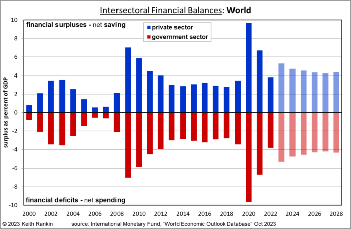 (Note on source data. The IMF does not provide World balances directly. But they do provide balances separately for advanced economies and for emerging/developing economies. The data shown is a weighted average of these two groups, with combined advanced countries having a 70% weight and emerging a 30% weight. Changing those weights would not make much difference to the chart.)