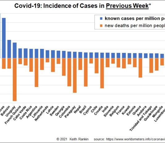 Keith Rankin Chart Analysis – Covid19: Recent Cases and Deaths